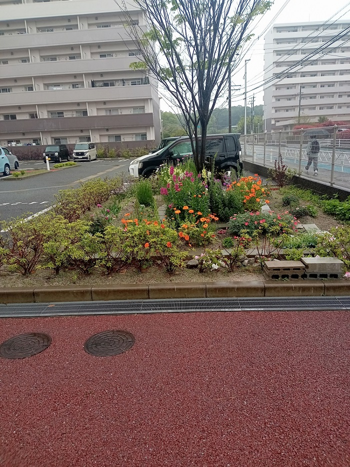 44棟近くの4つの花壇を管理しています。