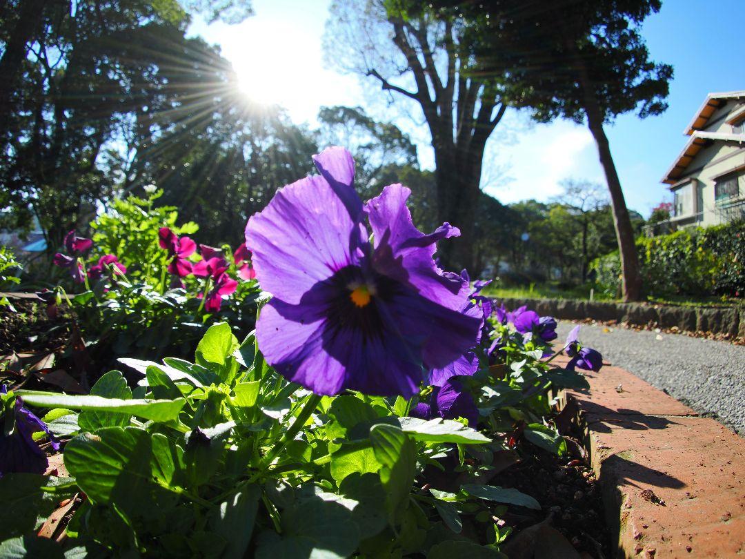 前回は夏の写真を投稿したので花はペンタスでしたが、今はとてもかわいいビオラ(パンジー?)が綺麗に並んで咲いています。(写真2)