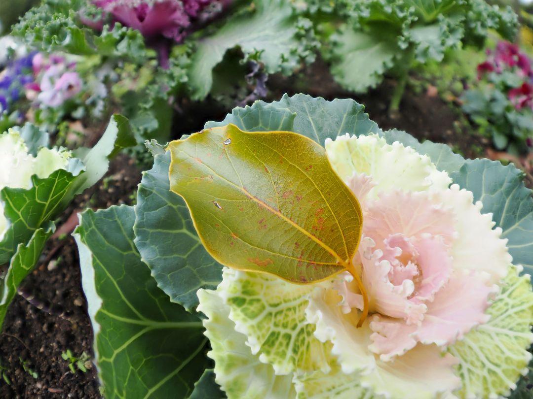 一枚目の写真は、綺麗な葉牡丹の上に、葉っぱがのっていたので、面白いと感じ撮影しました。